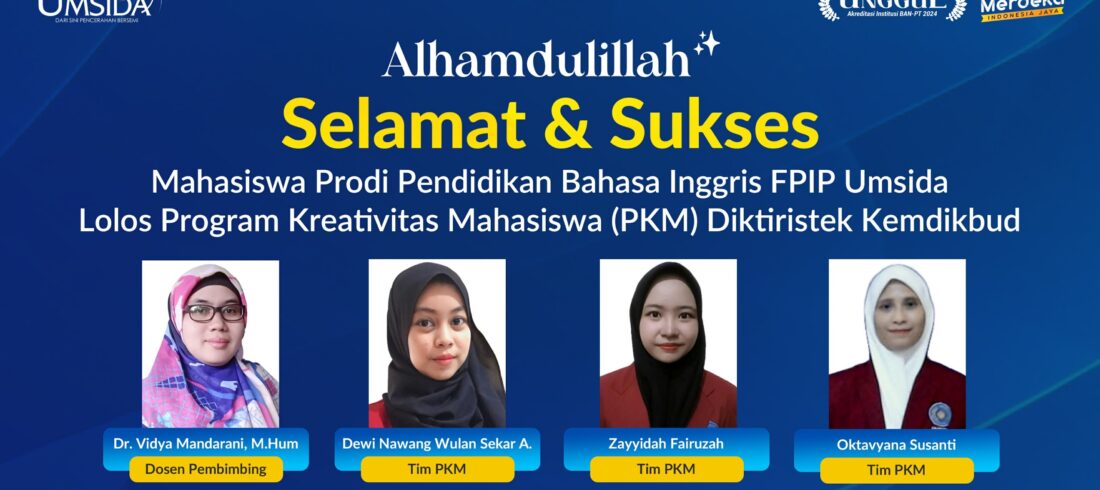 fpip.umsida.ac.id – 3 Mahasiswa Pendidikan Bahasa Inggris (PBI) Universitas Muhammadiyah Sidoarjo (Umsida) berhasil lolos Program Kreativitas Mahasiswa (PKM) Direktorat Jenderal Pendidikan Tinggi, Riset, dan Teknologi (Diktiristek) Kementrian Pendidikan, Kebudayaan, Riset dan Teknologi (Kemdikbud). Mereka adalah Dewi Nawang Wulan Sekar Arum, Zayyidah Fairuzah dan Oktavyana Susanti. Dengan...Read More